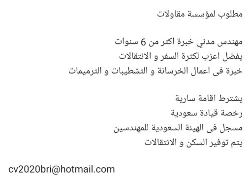 مطلوب مهندس مدني للسعودية خبرة لا تقل عن خمس سنوات