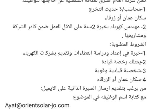 A Contracting company is looking for a Civil and Electrical engineers to be working at a Rehabilitation project in Amman ( it’s a 2 – 3 months project), requirements: