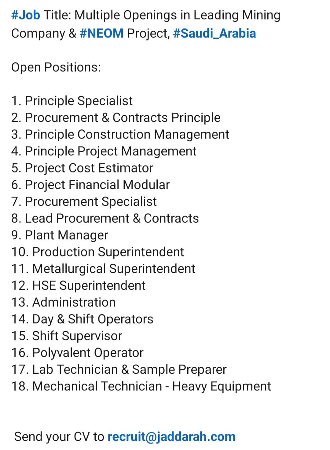 وظائف هندسية Multiple Openings in Leading Mining Company and NEOM Project Open Positions: principle Specialist